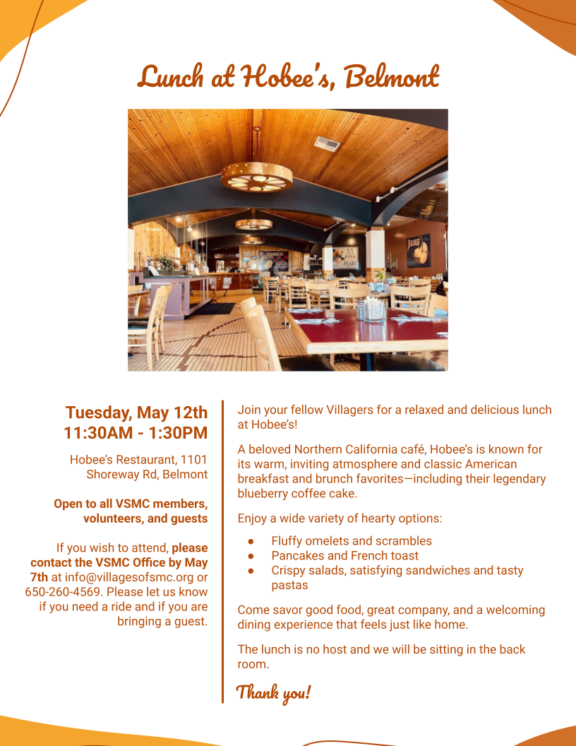 Tues May 12 Lunch at Hobee's Restaurant in Belmont at 11:30AM